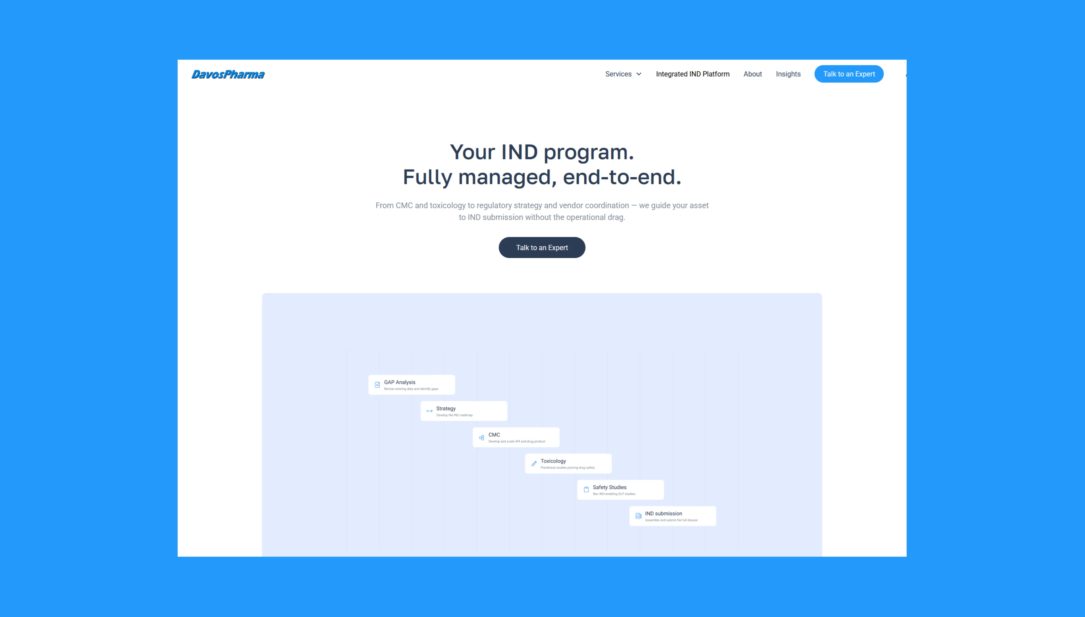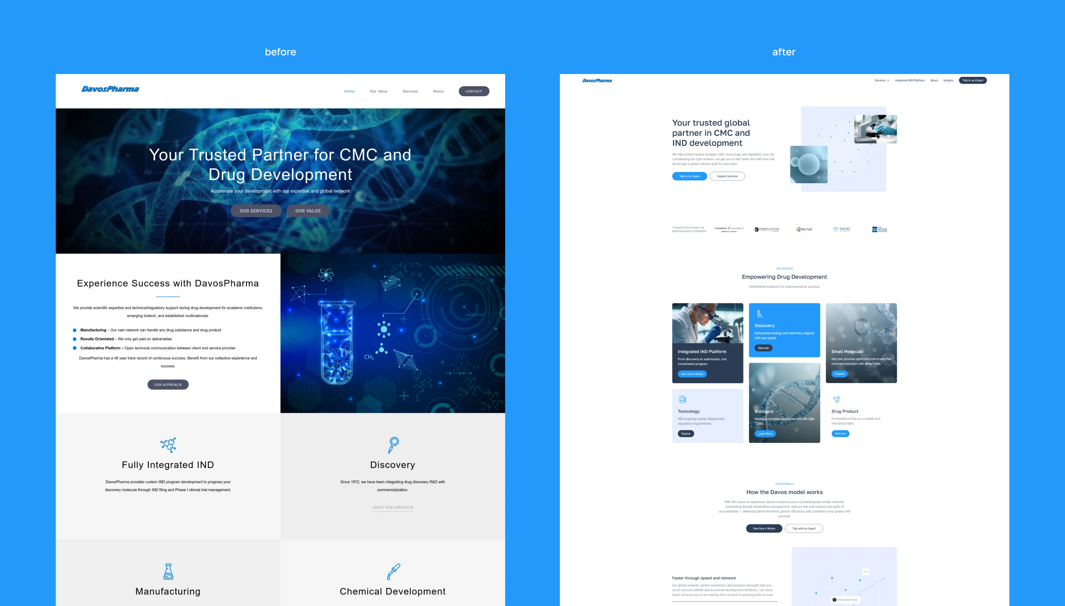 Davos Pharma, a global pharmaceutical services company, needed a modern digital presence that clearly communicated their value and supported their lead-generation strategy. The goal was to transform their outdated website into a streamlined, trustworthy, and conversion-focused platform that aligned with the expectations of biotech and pharma clients.